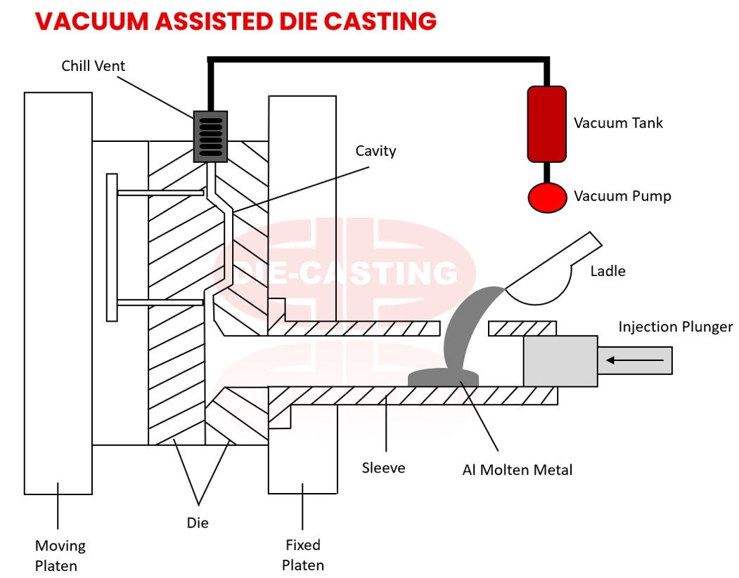 若能夠事先在模腔中建立真空環境必能獲得更高品質的鑄件,這就是真空壓鑄法的概念。真空系統的運作是將模腔維持在一個真空環境直到熔湯充滿模腔為止,模具中的空氣是藉由開啟真空泵管路並透由波浪排氣閥即時抽取而排出,當模腔維持在真空狀態,金屬液將會提高流動性並容易流至形狀複雜之凹槽處,避免因熔湯太早凝固導致充填不良之湯界痕。